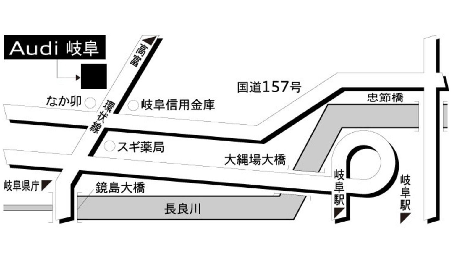 Audi 岐阜ショールームは国道157号沿いにあり、JR東海道本線 岐阜駅から約4.5km、車で約6分ほどの場所に位置しております。
